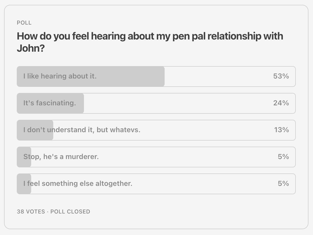 I want to share last week’s poll results, where I asked for your feelings about my friendship with John. I learned most of you are interested and feel my cadence of sharing is balanced. Thank you for your feedback.